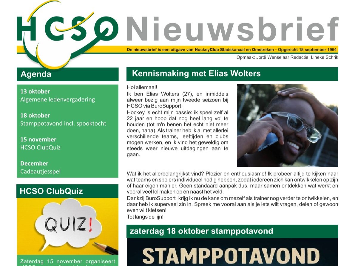Lees hieronder de HCSO Nieuwsbrief van september, met hierin o.a. de week van de scheidsrechter, Elias stelt zich voor, de Grote Clubactie, de HCSO Stamppotavond met Spooktocht, de HCSO ClubQuiz en meer....