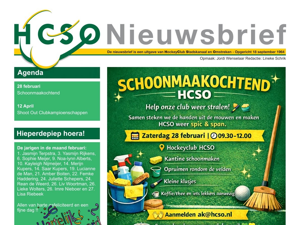 Lees nu de HCSO Nieuwsbrief van januari, met hierin o.a. een tweetal vacatures, de HCSO Schoonmaakochtend, verslag Padeltoernooi en meer....